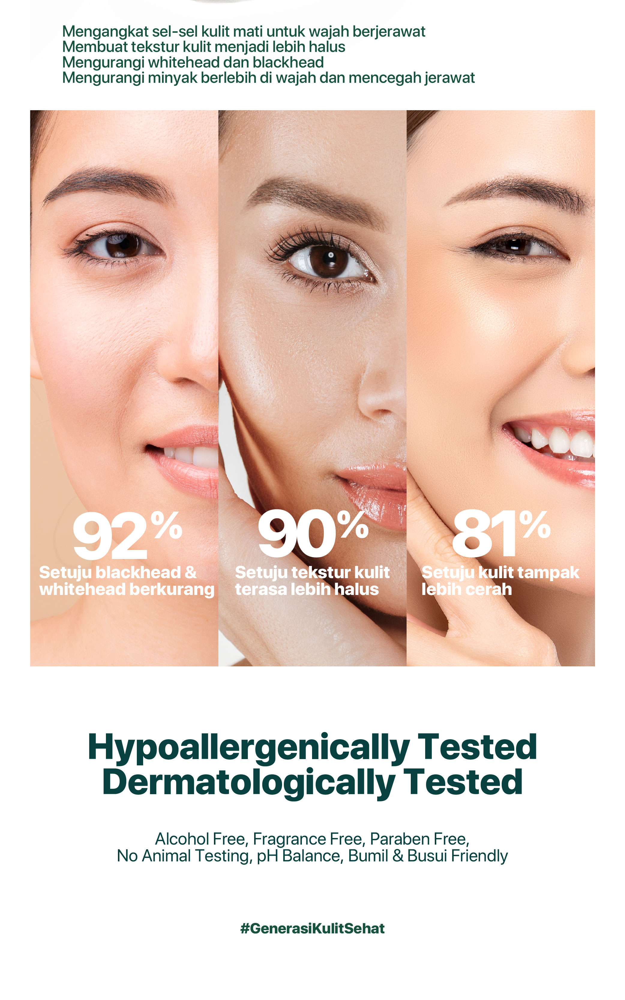 mengatasi permasalahan kulit kusam, dan menjadikan kulit lebih halus. Kandungan eksfoliasi yang lembut dan