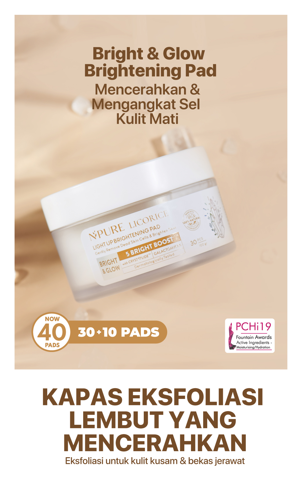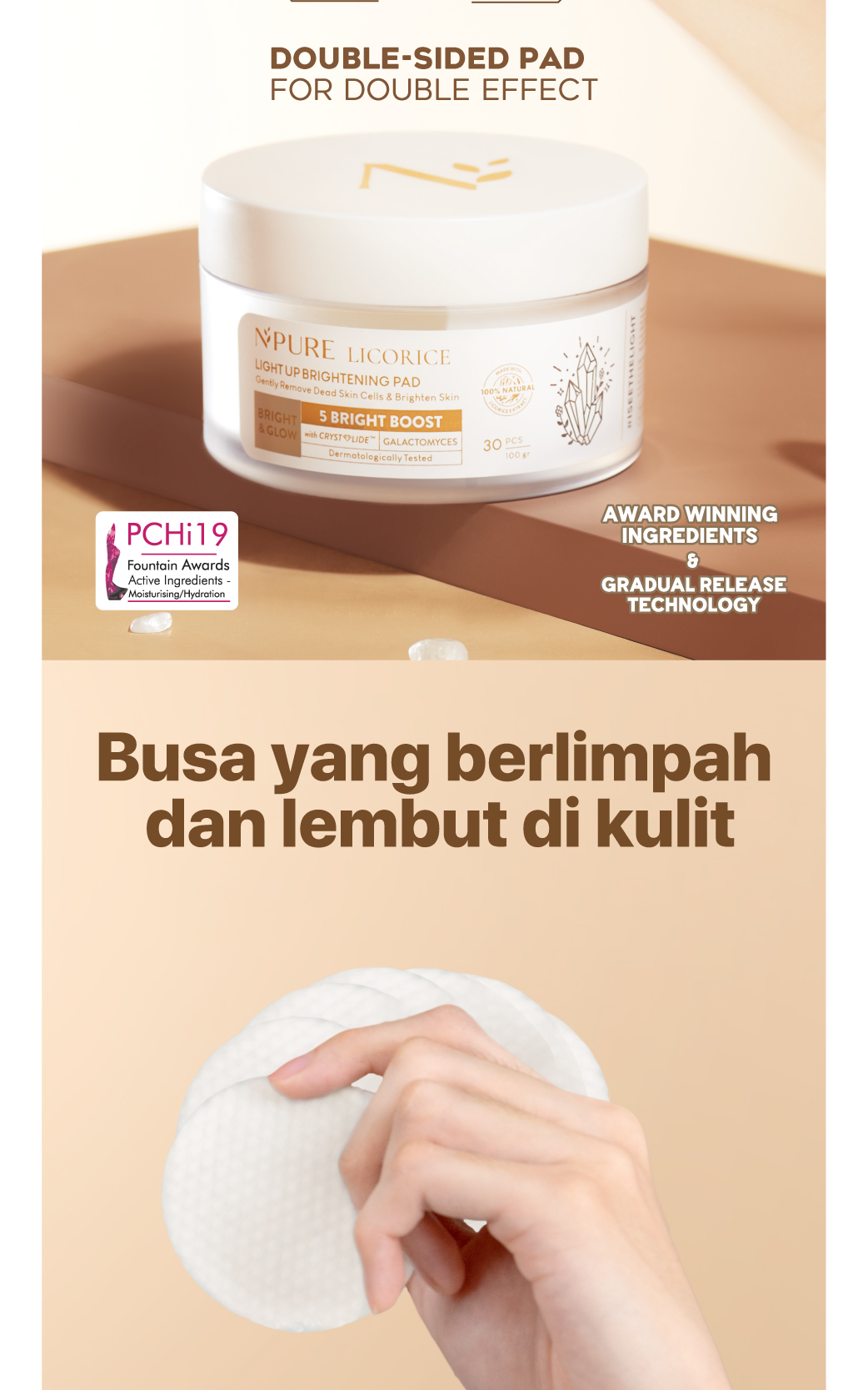 Setelah membersihkan wajah, usapkan NPURE Licorice Light Up Brightening Pad dengan lembut pada seluruh