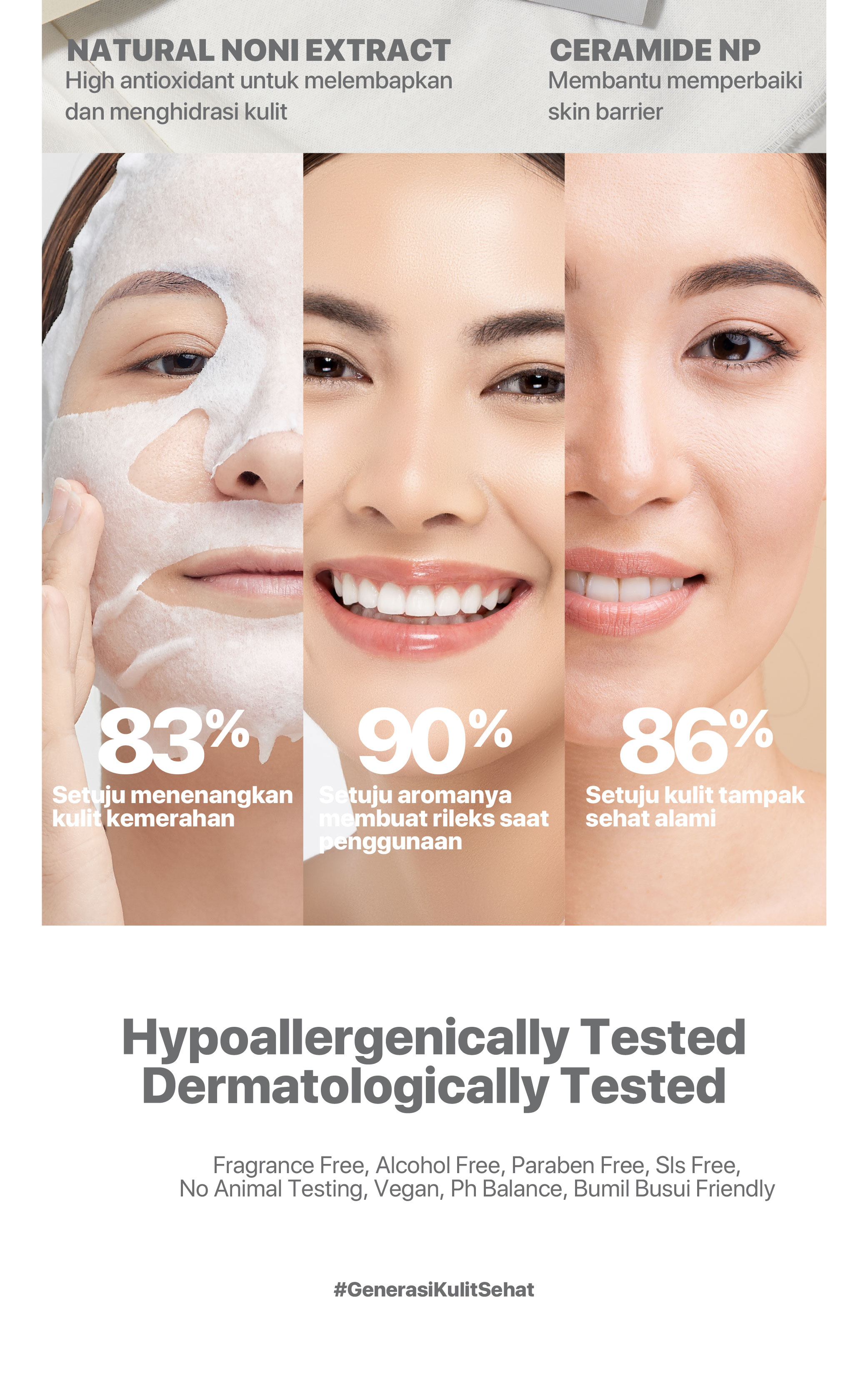 Masker wajah hypoallergenic dengan biodegradable sheet yang mengandung Natural Noni Extract, 9X Probiotics